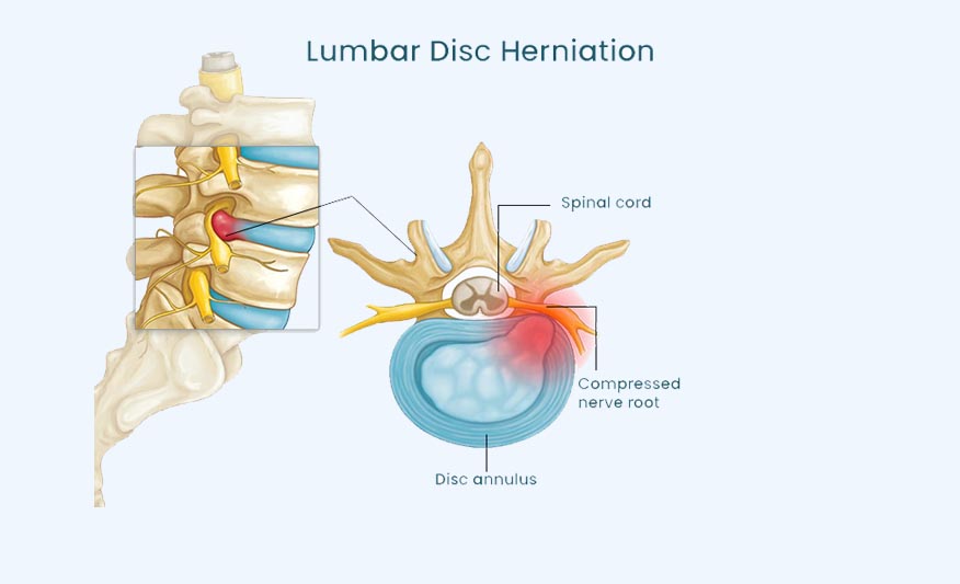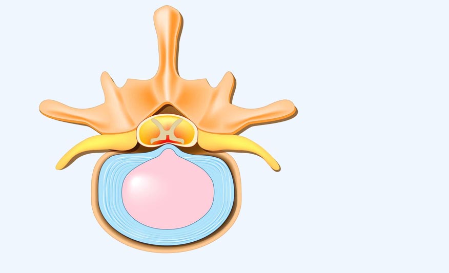 A bulging spinal disc occurs when the disc's soft, jelly-like center (nucleus) is squeezed into cracks in the disc's outer covering, weakening and stretching that covering. As a disc bulges out from between the neighboring bones (vertebrae), it can press on nerves causing severe pain that can travel to the legs called sciatica or arms and can cause numbness, weakness, or pain..